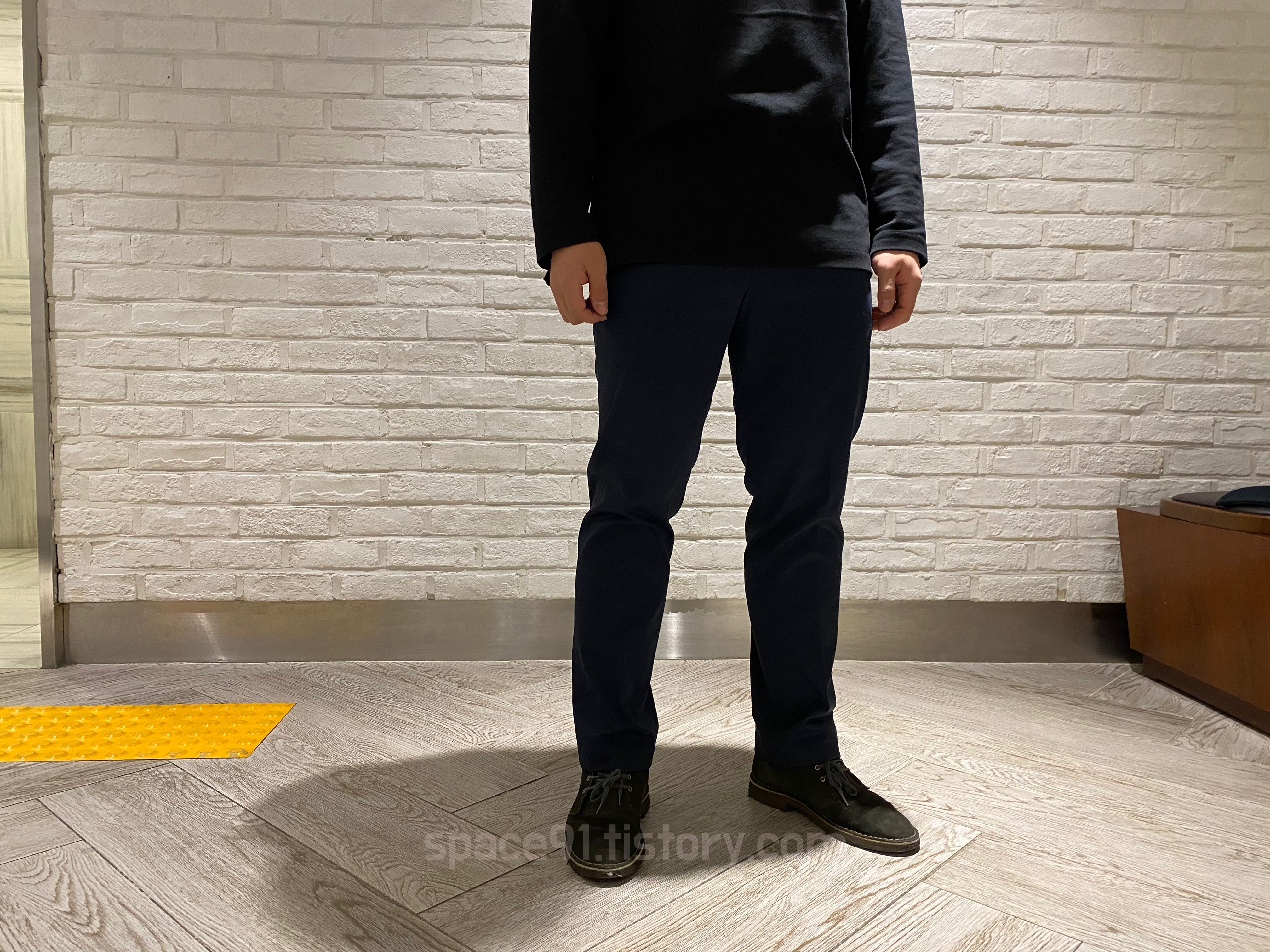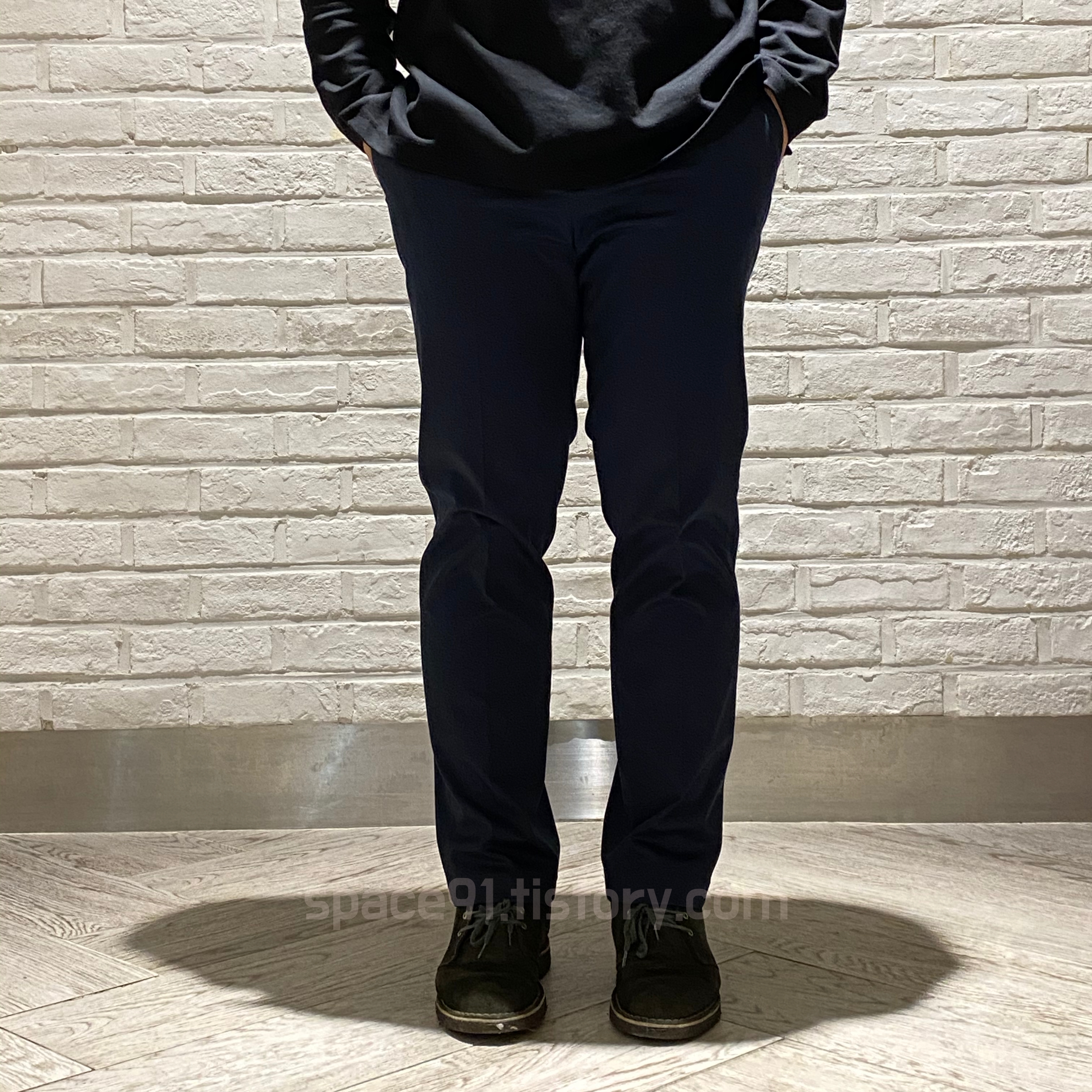 밝은곳에서 찍으면 조금 더 네이비색이 도드라져 보입니다(이정도로 밝은 색감은 아닙니다). 다리에 딱 붙어서 떨어지는 핏이 마음에 들어서 찍어보았습니다. 너무 마음에 드네요!